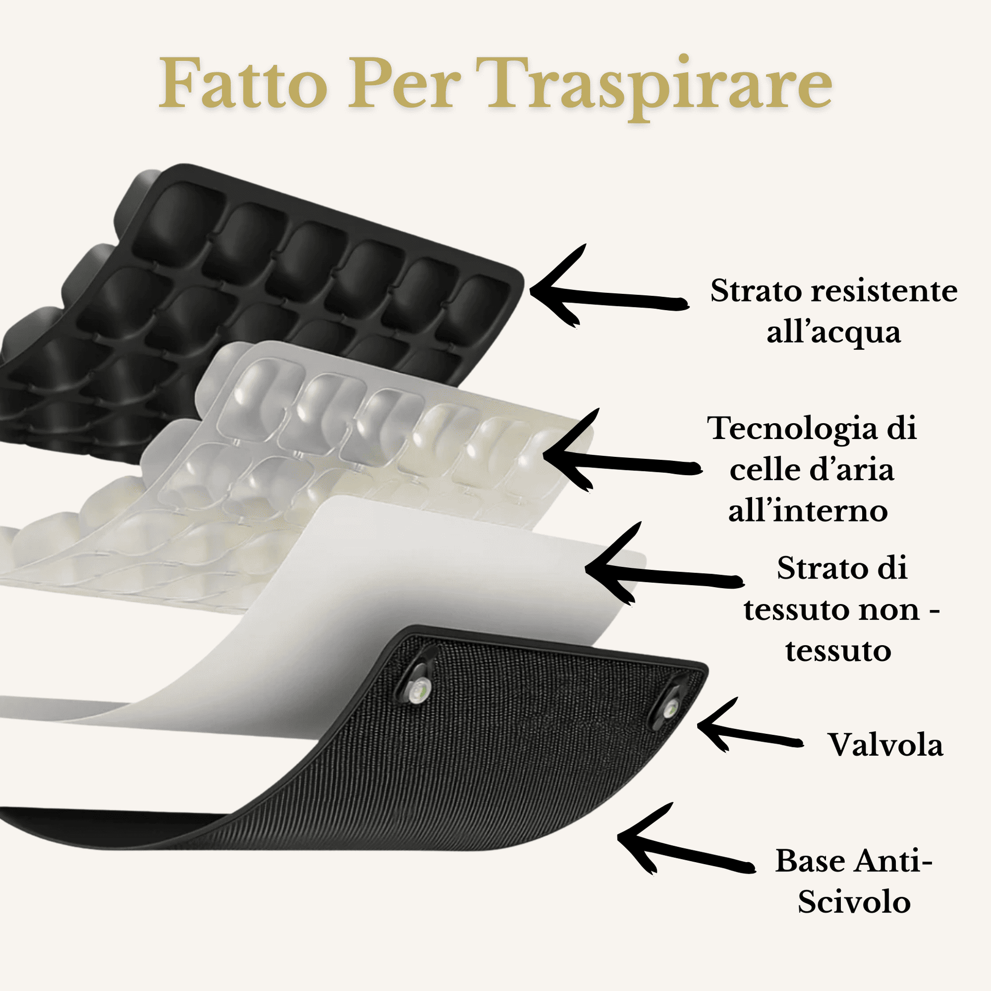 Le fessure tra ogni cella d'aria consentono all'aria di fluire al di sotto per prevenire l'accumulo di calore e sudore. Nessun appiattimento, nessun dolore, solo comfort ammortizzato per tutto il volo.