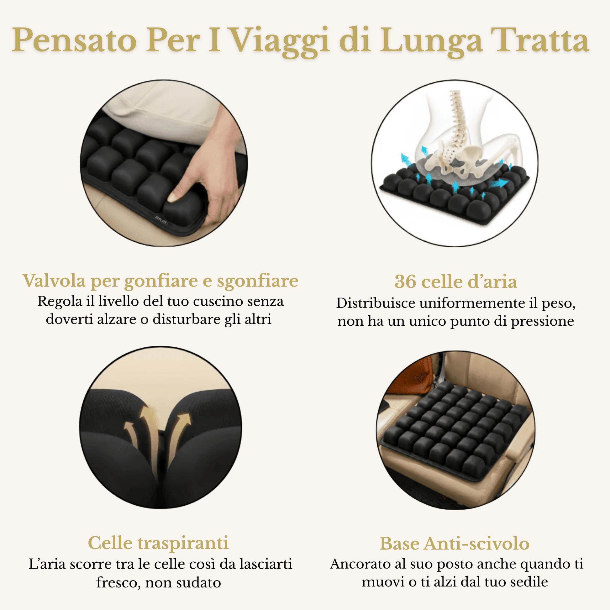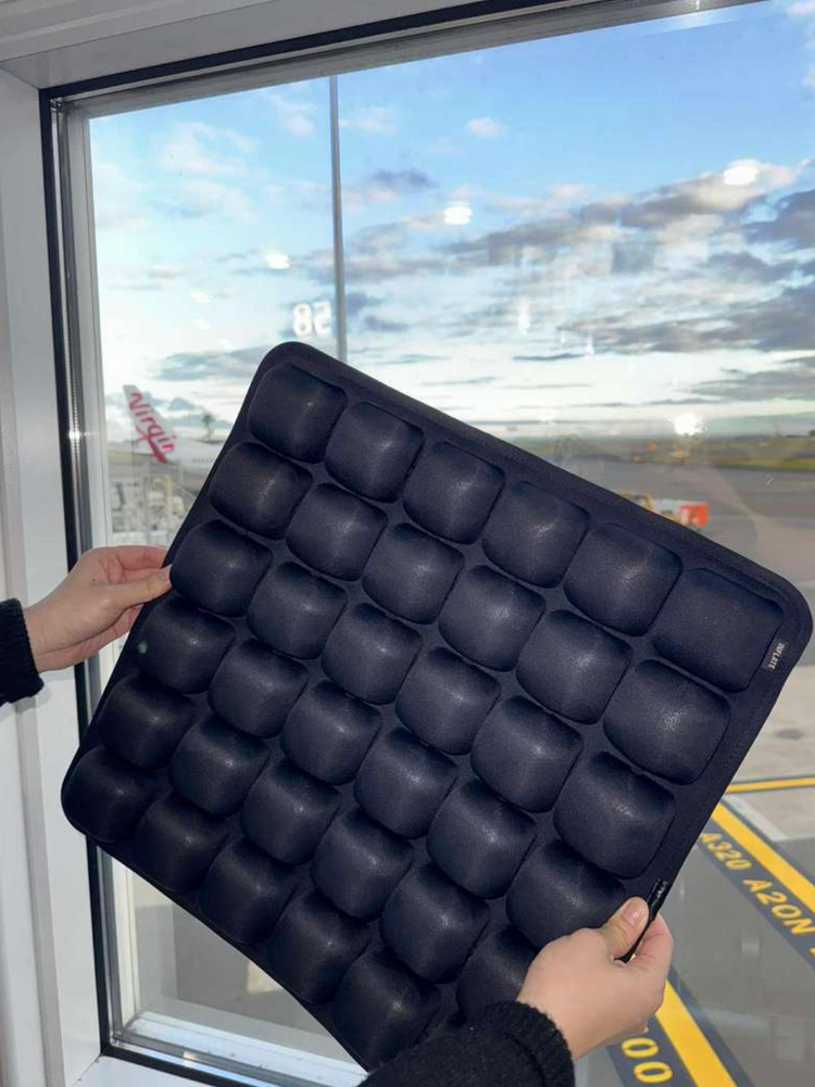 Grazie alle sue 36 celle d’aria Medical-Grade, scarica la pressione da osso sacro, fianchi e zona lombare, permettendoti finalmente di viaggiare — in aereo o su lunghe tratte —senza il dolore cronico che ti ha rovinato i primi giorni di vacanza dopo il viaggio o tolto la voglia di prenotare quel volo da 12 ore.